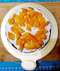 6.将切好的芒果丁摆在奶油上后再盖上第二片蛋糕