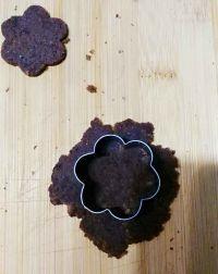 9.将先前修下的表层碎蛋糕捏成小团擀薄,然后用花朵饼干模刻出三朵可可小花