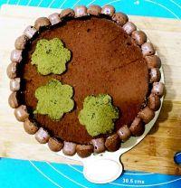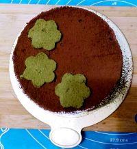 12.然后将三朵抹茶花朵移到可可蛋糕上即可