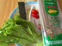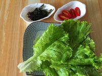 2.将圣女果洗净、切片,海苔切丝、生菜洗净,沥干水分撕成小块备用。