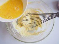 2.黄油切小块软化,略微打发后加入糖,打至蓬松