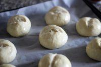9.将面团分成8块,滚圆,放入烤盘,刷一层蛋液,从顶部划开