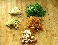 7.接下来做调料,姜,蒜、榨菜分别切成末,葱切成小葱花。