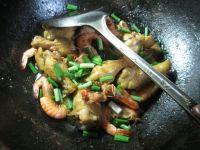 8.然后,煮至汤汁差不多了,合入已清洗好的基围虾翻炒翻炒至熟,搁入香葱,即成。
