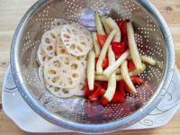 4.将腌好的嫩姜芽,红甜椒冲洗掉表面盐分和过凉后的藕片滤尽水。