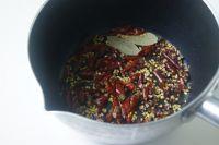 2.辣椒用剪刀剪成小段,然后和花椒、香叶一起放入锅里。