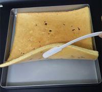 11.先将另一6连模倒满后,再将剩余的蛋糕糊倒入方盘中